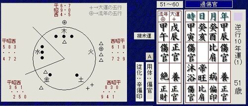 この女性は一度も結婚しなかったようです。仕事は熱心です。親がなくなってから兄と遺産相続でもめました。 傷官が3つもあり仮傷官の女性です。傷官は官(夫を意味する)を尅すため、結婚運や夫運が良くありません。家庭を意味する財星がないため、家庭に意…
