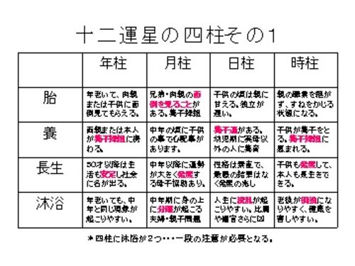 四柱上に来る十二運の意味です。今日はその1で胎から沐浴まで。 胎 年柱:年老いて、肉親または子供に面倒見てもらえる。 月柱:兄弟・肉親の面倒を見ることがある。養子縁組。 日柱:子供の頃は親に甘える。独立が遅い。 時柱:親の職業を継がず、すねをか…