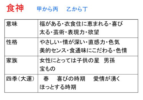 食神は吉星と言われていますが、男性と女性では少し違います。男命→吉面:50~60%位 凶面:40~50%位女命→吉面:95%位 凶面: 5%位 食神は人間的なやさしさが有るのですが、男性は官星が有ったほうが良いとされるので、食神だけでは、ニコニ…
