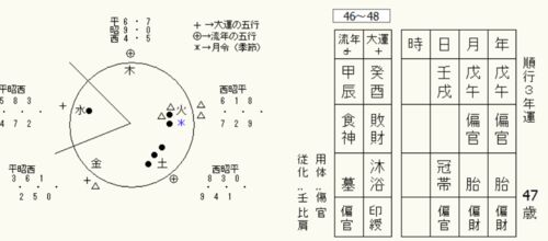 この方は、生時不明ですが、月柱と年柱に偏官が並んでいます。下の変通星も偏財が二つ、偏官もあります。つまり「偏」ばかりで、比肩が一つしかありません。 はい、想像通りの人で、「偏」は動いて刺激を受ける性質が有り、フットワークは軽く良く動く人です…