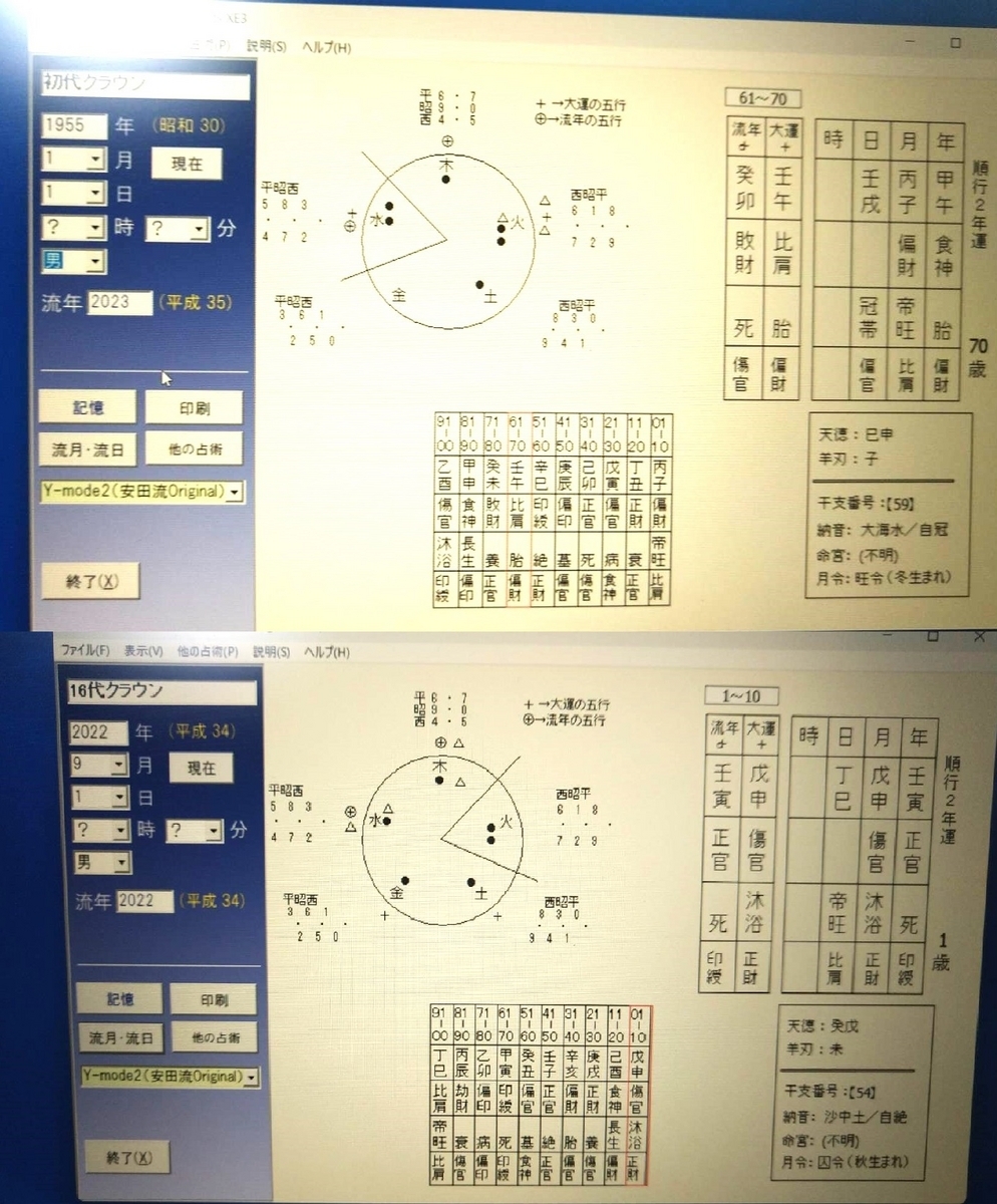 ところが、16台クラウンが出てきた2022年は、大運、流年ともになんとダブル比肩です。今年2023年は大運比肩の最後で流年がテンション低い敗財になります。来年から大運が敗財と景気良くないですね。
