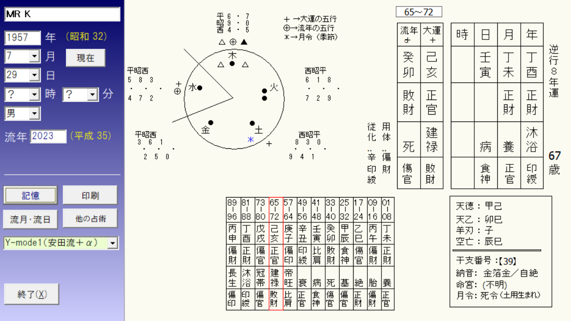 大運正官になったとたん財官双美となりソーリに抜擢。もう一人のミスターKを破って当選(どっちがなってもなぁ~)。しかし去年、流年に比肩、今年敗財が出ていることで、安倍元総理の狙撃事件、長男の不祥事、旧統一教会問題、マイナカードの問題等など問題続出、挙句の果てにLGBT法なんぞ通してから、保守派に愛想つかされる始末。支持率も20パーセント台とガタガタ。ちまたでは年内ソーリ交代のうわさもあるが、11月は敗財、12月は食神と思いきや、どっこい羊刃付きだぜ。