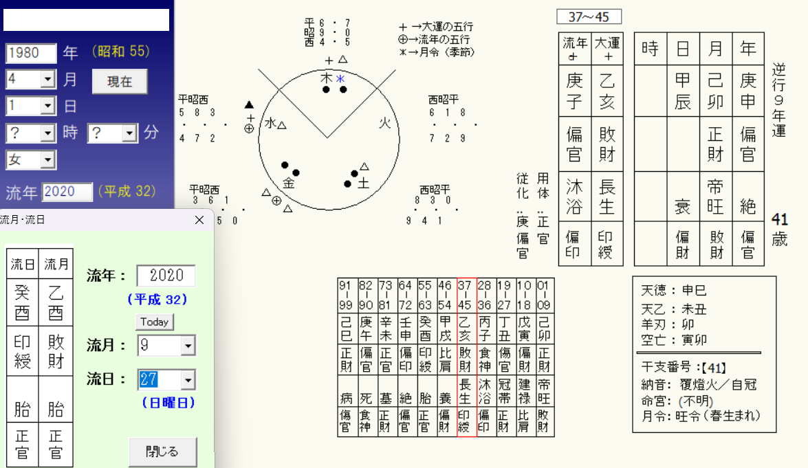 天徳もあるのですが、この方の羊刃は卯、亡くなった時期の中年期を表す月柱に卯があり、それを刺激する飛刃(ひじん)は酉。亡くなった2020年9月27日は、流月、流日ともに酉が出ていました。大運の敗財もモチュベーションが低い時期でした。それまでの大運が財星や食神といった吉星だったことと比較すると、敗財の時期はガタっと急激に運気も気持ちも下がる時期でした。本体に帝旺と絶があるのは、急激な運気の急落を意味します。内面はプライドの高いところが有るので、他人にマイナス面を見せなかったと思われます。ご冥福をお祈りいたします。