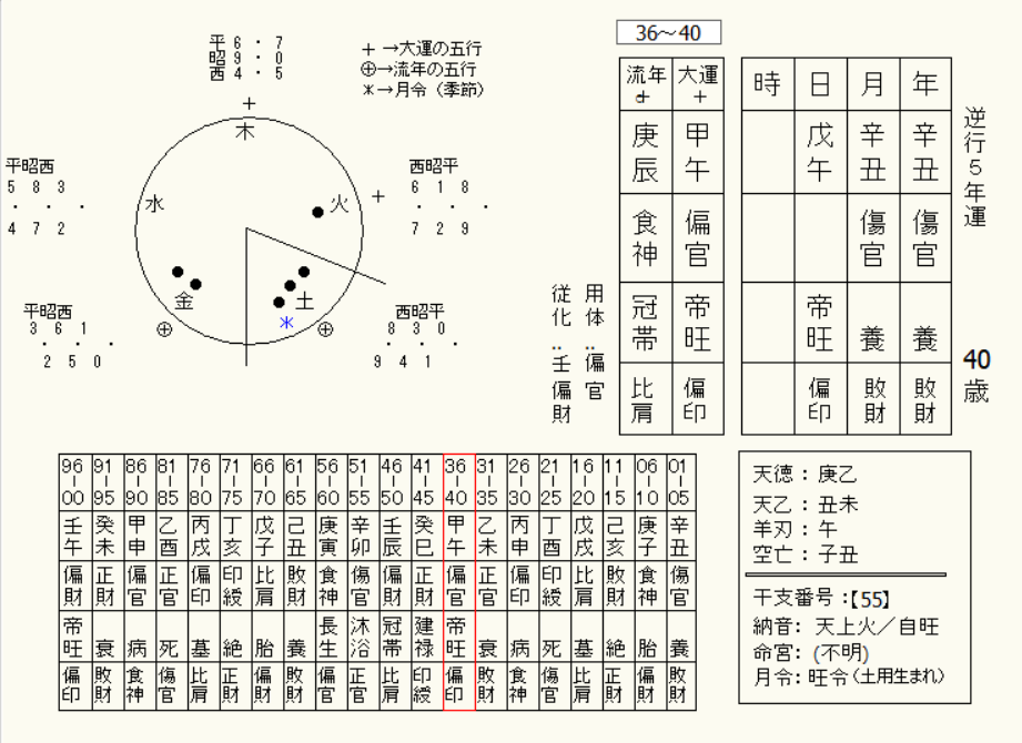 数え年40歳の命式表を出してみました。発症した時期が節分前の場合、前年で命式表を出しますが、発症した時期はさだかではありません。
