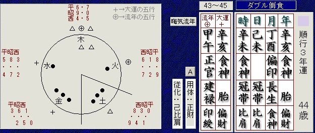 この命式はダブル倒食です。食神は女性にとって子供を意味しますが、それを尅す偏印がど真ん中に出ています。従って、子供を欲しくないか、或いは欲しくてもでき難い女性です。