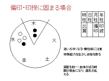 漏星を剋すので、食神が巡る時期が倒食になり、運気が乱れやすくなります。必ずしも偏印ではなくても、印綬が多すぎても倒食的になります。