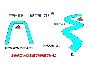 2015-08-24 良い地相1 解説 #風水 巨門土星格・・・図のように家を囲むように道路や川が回りこむ地形です。「巨門」とは財運を意味する星の名前です。 九曲水格・・・川がゆっくりと曲がりくねっています。この川は道路と見立ててもかまいません。気が逃げて行き難い地で、吉です。 http://www10.plala.or.jp/healing/