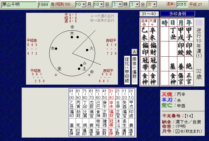 時柱がわかりませんが、食傷星も多く、印綬傷官的な要素もあります。顔も細く、キルビルVOL1で刃物を操るGOGO夕張の役にはまりすぎていたので、傷官性が強そうな印綬傷官型に近い感じがします。もしかしたら時柱に傷官や食神が出ているかもしれません。たとえそうでなかったとしても、今年は食傷星が四つ以上となり大過し傷官化するので事故に遭遇しやすかったわけです。