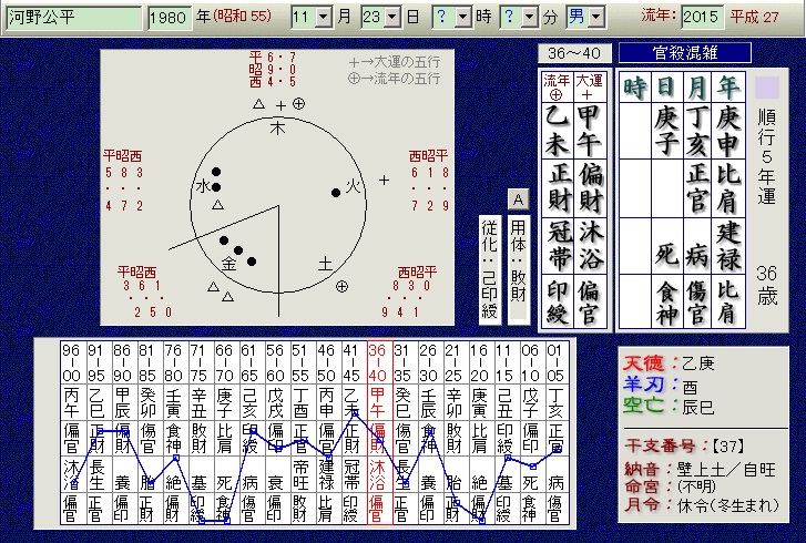 スポーツ選手の勝敗の場合、大運、流年よりも、瞬時にして勝敗が決まるので、その日のコンディション、その日の運気が左右することが多いです。ちなみに流年が正官、流日が偏官建禄でした。