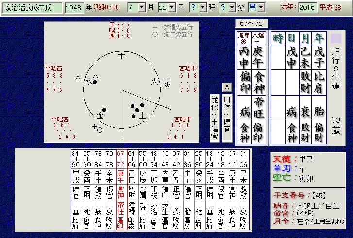 去年2015年も会計担当者や管理団体の政治資金問題等で騒がれていましたが、今年は業務上横領の疑いで当人も嫌疑をかけられています。今年の運気は、流年に偏印が来て倒食となります。金銭的に、落選続きでにっちもさっちも行かなかったのでしょうか。運気も行き詰っています。