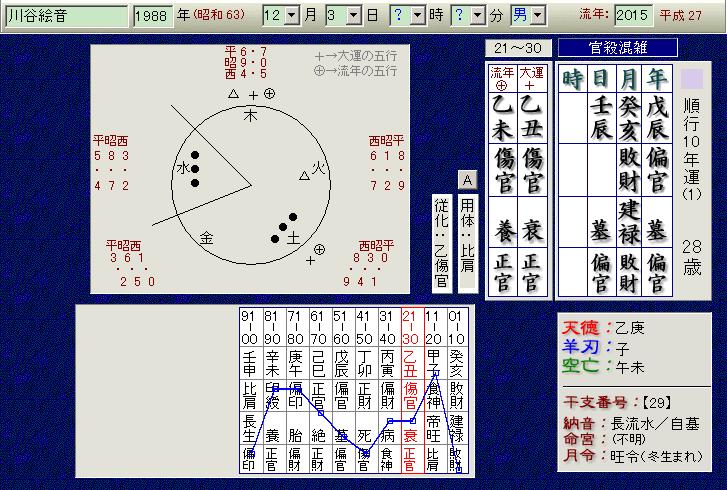 月柱敗財は人情的で慰めや情を求めやすいので、もともと不倫には注意すべきでした。全体に水が多く納音も長流水で水、天干も水なので色情には注意です。年柱は偏官。これは意外にも男っぽい星です。当流派では比劫星と官星の組み合わせを官殺混雑といい、一見大人しいですが、好き嫌いがはっきりしていて、行動的で言い出したら聞かないところが有ります。時柱に印星が出ていると、官印両全となり社会で大きく才能を発揮しますが、印星や財星が無いとおっちょこちょいになってしまいます。(さてどうでしょうか?)