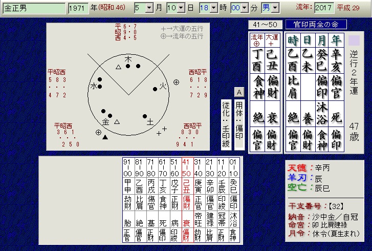 当流派では逆行二年運として看ることもありますが、二年運だと金局は出ないまでも大運が正官長生傷官(上下の尅あり)となり、官が大過(合計6つ)するため、同様の鑑定結果となりそうです。