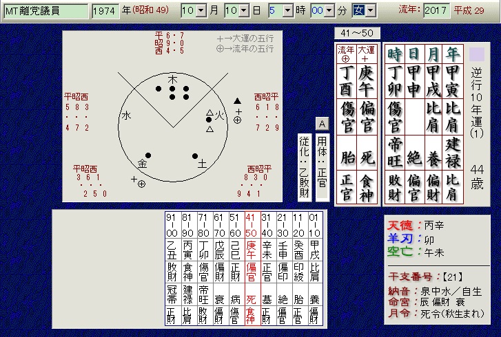 3年ほど前から大運に庚午が来て寅午戌で火局していました。時柱傷官であれば、激しい尅の偏官です。今年、流年傷官で偏官が傷官に挟まれサンドイッチです。官(仕事、社会的立場)を尅し離党するはめになったのでしょう。